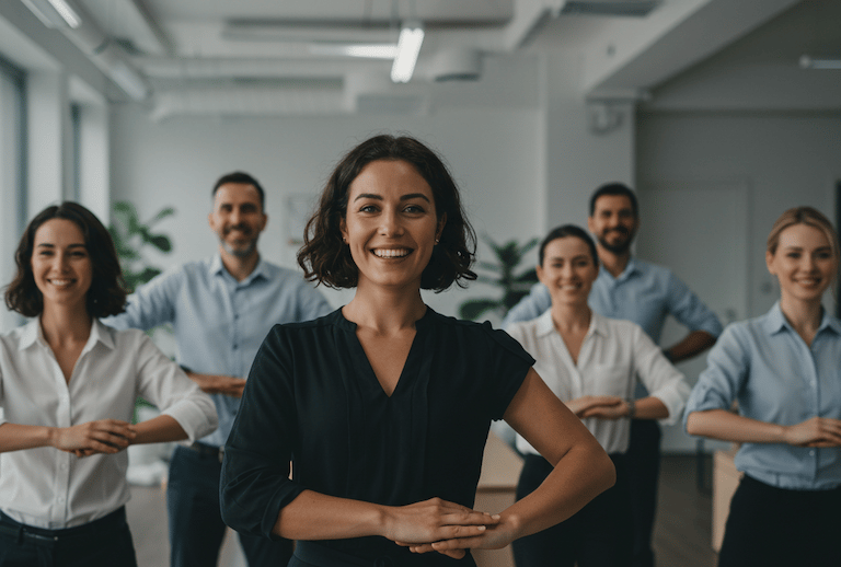 Office workers overcoming stiffness, posture issues, and stress